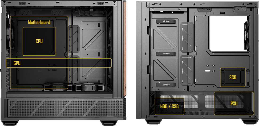 Mid Tower / GPU 405 mm / 2×SSD + 2×HDD / 2×USB 3.0 + 1×USB-C + Audio /
