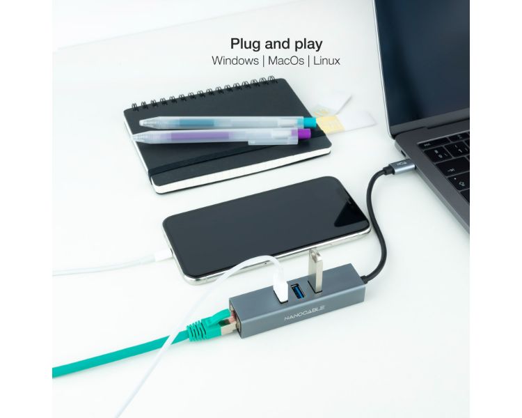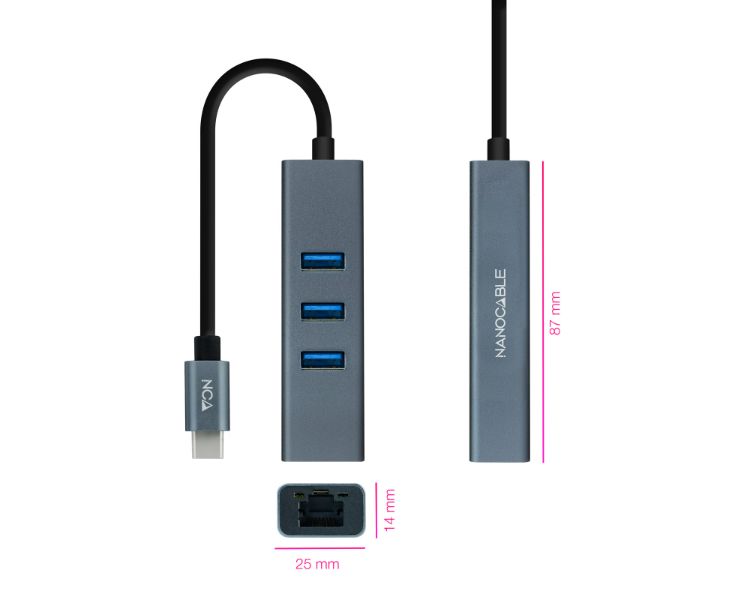 CONVERSOR USB-C A ETHERNET GIGABIT + 3xUSB 3.0 15cm GRIS NANOCABLE
