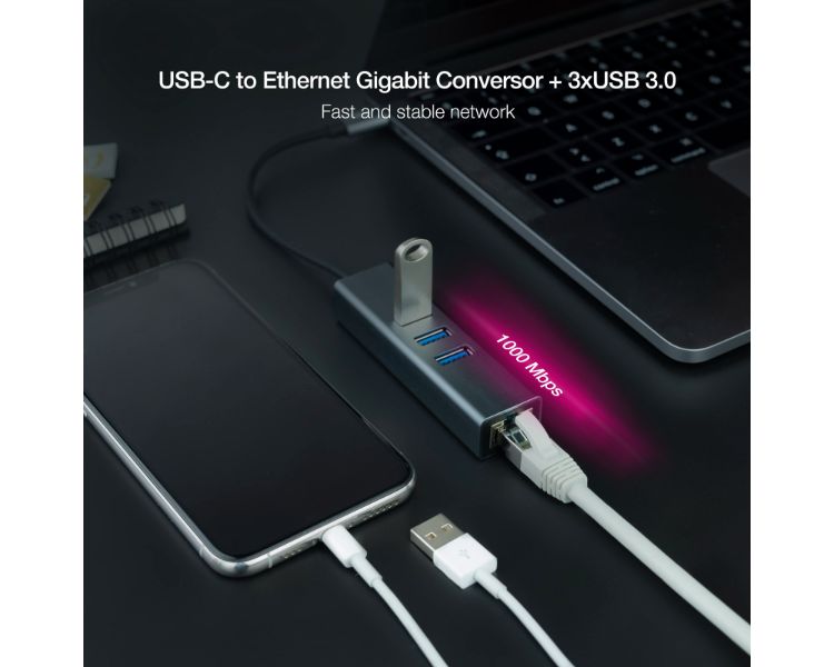 DE USB-C a 3xUSB-A, RJ45/ GIGABIT/ ALUMINIO/ 15cm