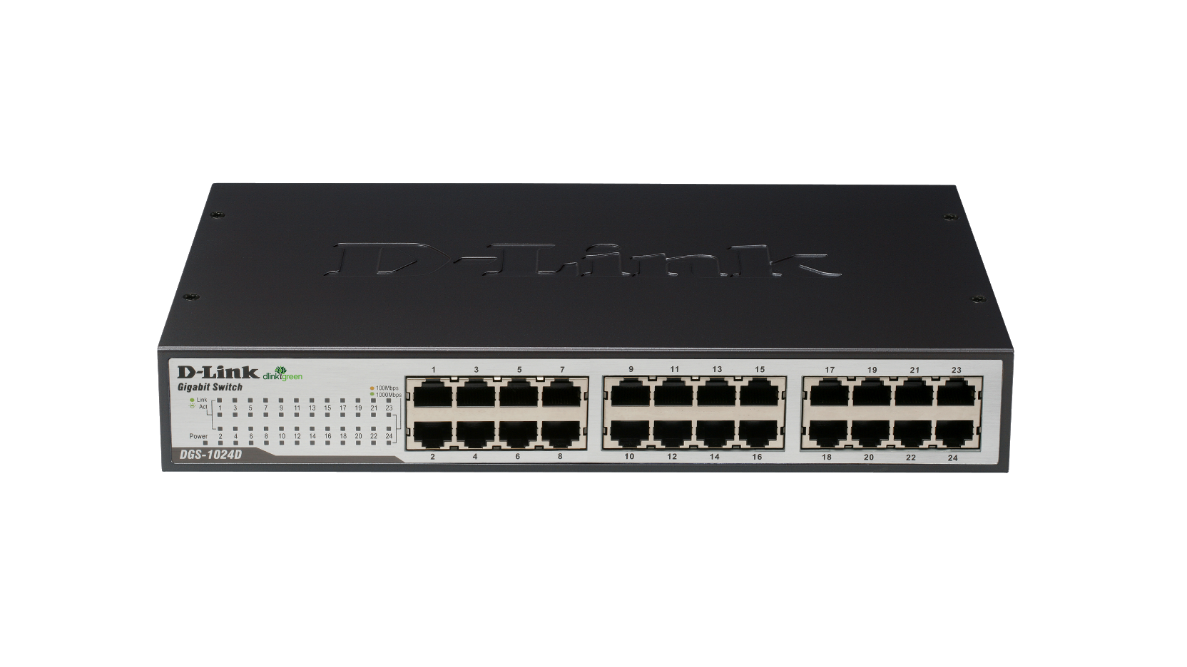 El Switch D-Link DGS-1024D, un switch de sobremesa con 24 puertos 10/100/1000Mbps que ofrece un elevado rendimiento en un dispositivo que nos permite ahorrar espacio y dinero. Otra característica en este switch es que todos los puertos negocian automáticamente el ajuste del modo MDI/MDIX (Up-Link), evitando la necesidad de crear cables de par cruzado.